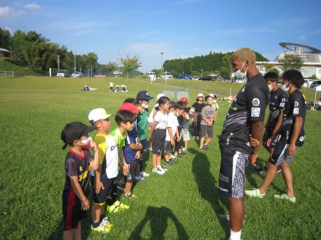 最後に全員コートに集合して、選手が高く蹴り上げたボールをヘディングで受け止める技の披露もあり、子ども達は「すごい」と歓声を上げていました。