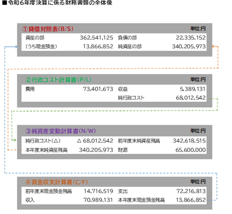 ①貸借対照表(B/S) ②行政コスト計算書(P/L) ③純資産変動計算書(N/W) ④資金収支計算書(C/F)